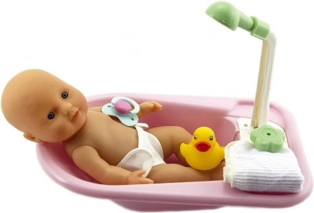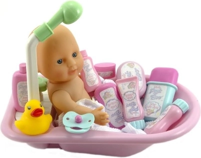 Roztomilé miminko pre malé mamičky. Panenka sa rada kúpe vo svojej detskej vaničke s obľúbenou kačičkou. Balenie obsahuje všetko potrebné na kúpanie: šampón, mydlo, penu do kúpeľa a ďalšie lahvičky, ktoré sú potrebné po kúpeli. Miminko je celoplastové a vie hýbať rukami a nohami.