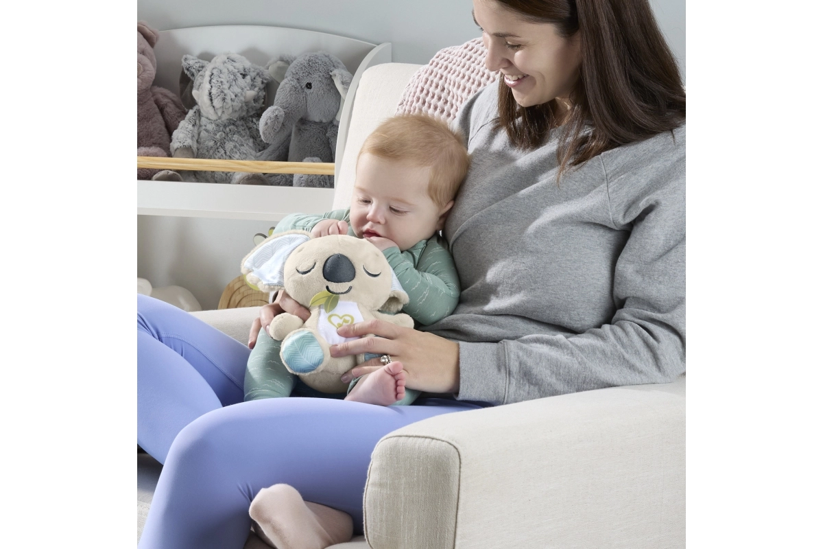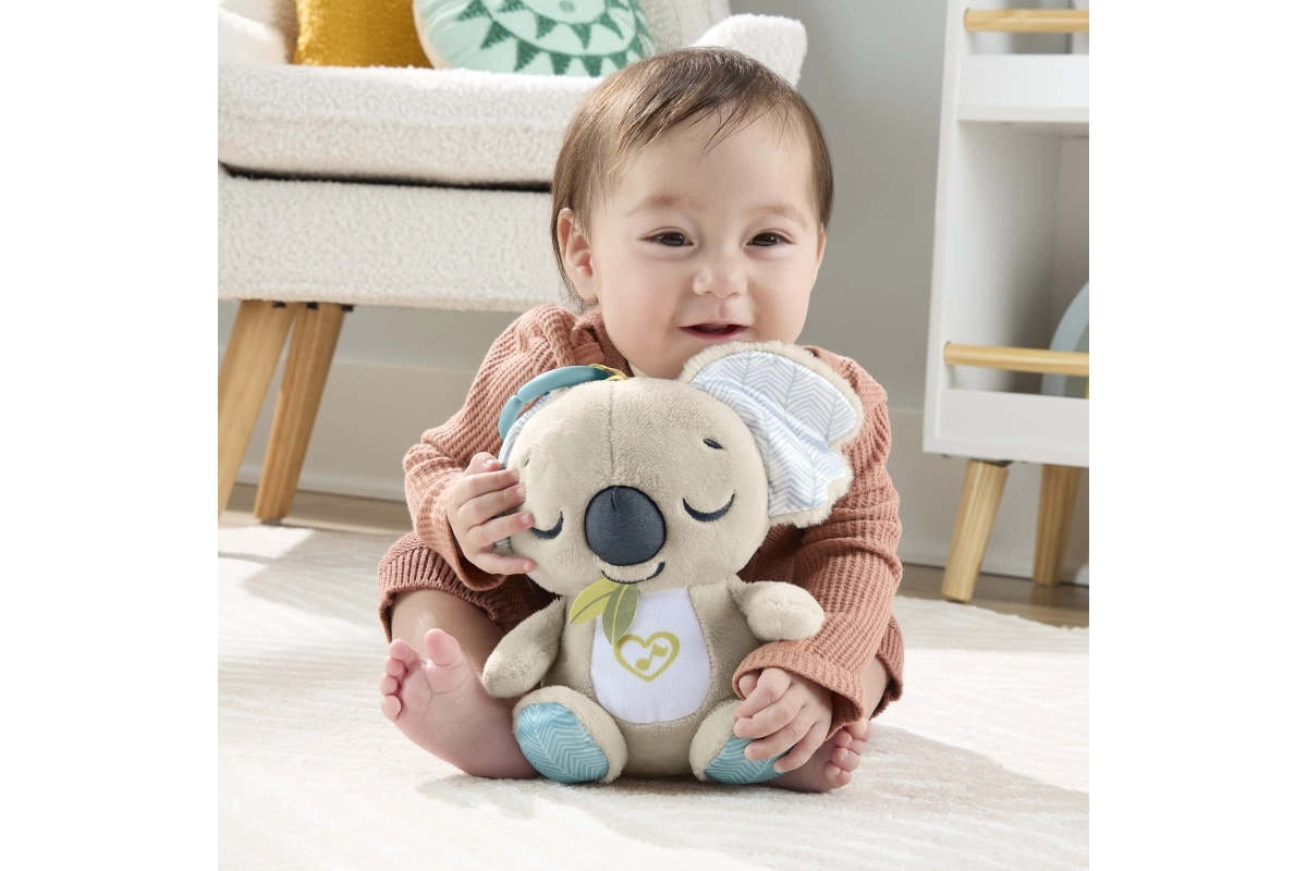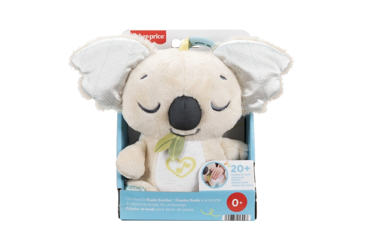 Roztomilá koala od Fisher‑Price upokojí bábätko doma aj na cestách. Skrytý prehrávač ponúka až 20 minút jemnej hudby, bieleho šumu alebo upokojujúceho „ššš“. Hebký plyš, saténové ušká a závesný klip na kočík či autosedačku robia z hračky ideálneho spoločníka pre najmenších.