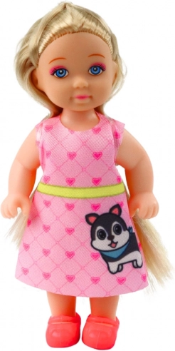 Mini Bábika so Psíkom a Mačkou s príslušenstvom je ideálna pre malé opatrovateľky. Bábika o výške 12 cm, oblečená v ružových šatách zdobených srdiečkami, je sprevádzaná plastovými figúrkami zvieratiek. Súprava obsahuje: