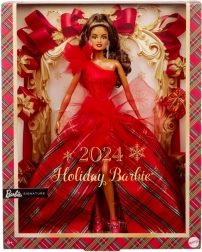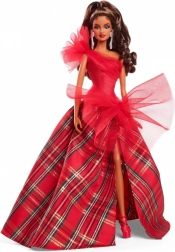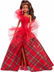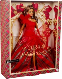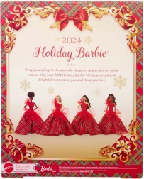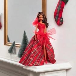 Sviatočná Barbie 2024 má pôsobivé žiarivo červené korzetové šaty s jedným ramenom, ktoré sú krásne spojené s objemnou plesovou sukňou v klasickom kockovanom vzore. Veľké tylové akcenty dodávajú klasickému štýlu moderný charakter, zatiaľ čo výrazné náušnice podčiarkujú celkovú eleganciu. Bábika je balená v obale ideálnom na vystavenie, čo z nej robí skvelý darček pre zberateľov alebo ako jedinečný prvok sviatočných dekorácií.
