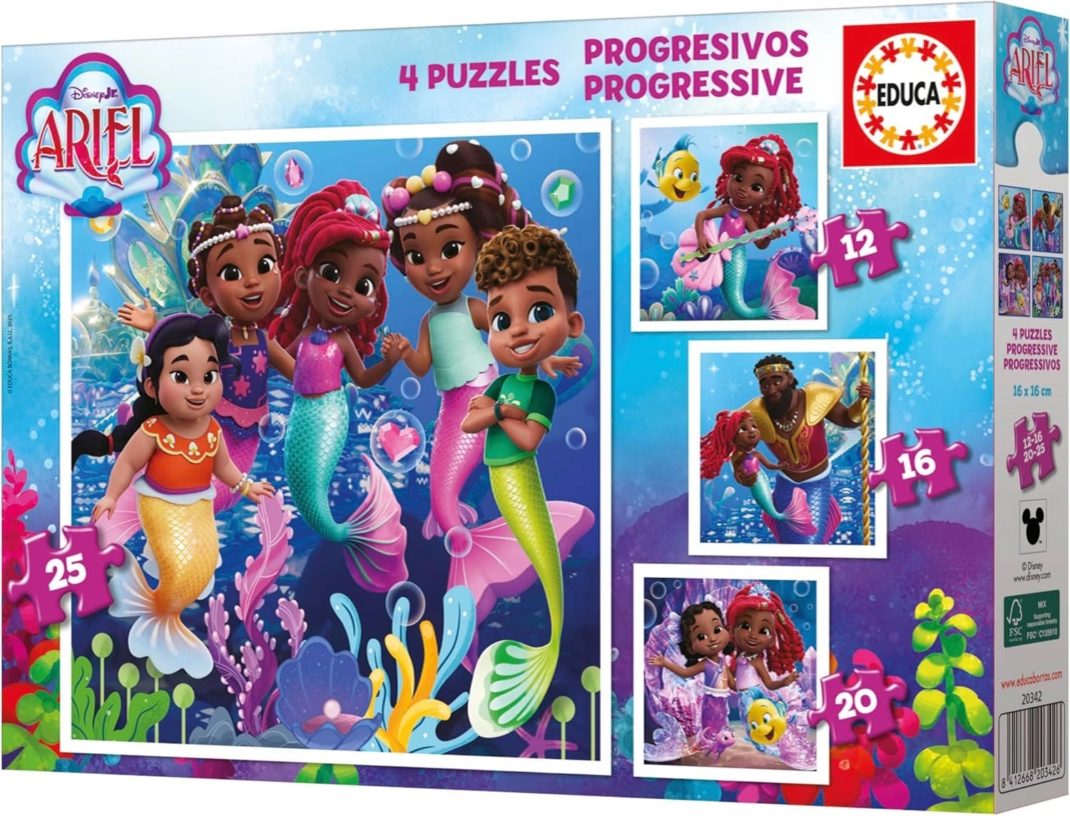 Objavte kúzlo podmorského sveta s puzzle Disney Ariel. Tento set obsahuje štyri progresívne puzzle s rôznou obtiažnosťou a rôzne veľkými dielikmi, ideálne pre malé aj väčšie deti.