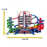 Garáž obsahuje tiež 6 kovových autíčok a vlak poháňaný na batérie, automatické výhybky, tunel s funkciou havárie a 2 motorizované výťahy. Rozmery po zostavení sú 128 x 78 x 73 cm.