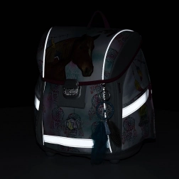 Školský batoh z rady Premium Light s elegantným motívom koňa ponúka viac než len pekný vzhľad. Je vyrobený z ľahkého materiálu, vďaka čomu váži menej než 900 g. Batoh je vybavený komfortným priedušným polstrovaním a širokými mäkčenými popruhmi, ktoré rovnomerne rozdeľujú váhu na ramená dieťaťa. Pre ešte väčšie pohodlie sú tu prítahy a hrudné popruhy.