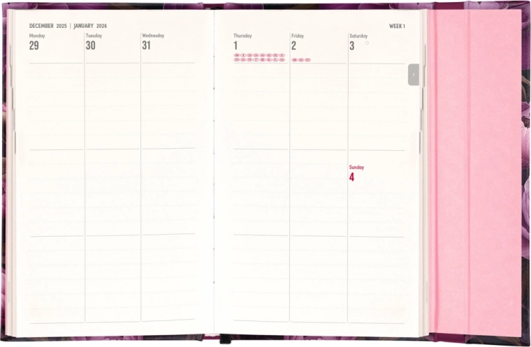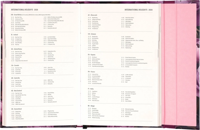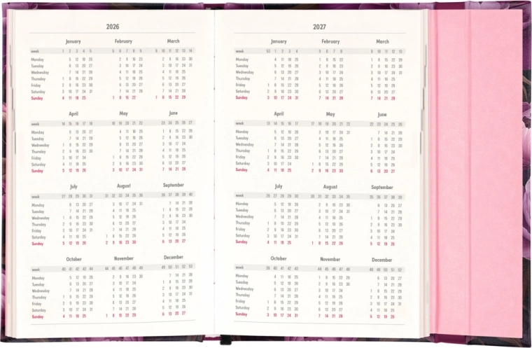 Obsahuje taktiež mesačné prehľady, ktoré sú ideálne pre plánovanie dovoleniek alebo prázdnin. Diár je nielen praktický, ale vďaka dizajnu s motívom fialových kvetov aj štýlový doplnok vášho pracovného stola.