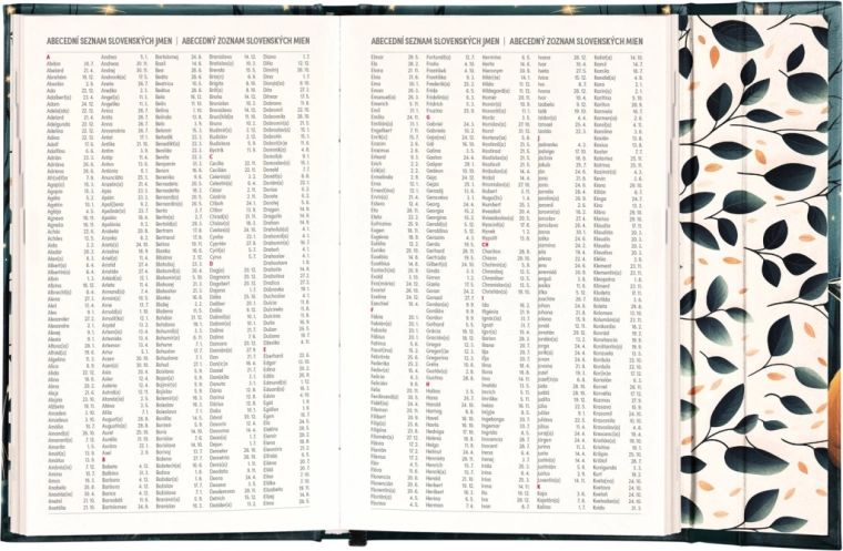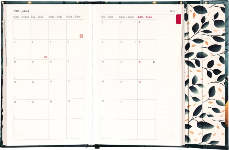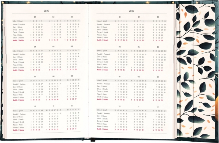 Je vybavený mesačnými prehľadmi, ktoré umožňujú jednoduchšie plánovanie dlhších časových úsekov ako sú dovolenky alebo školské prázdniny. Tento diár obsahuje tiež zoznam českých a slovenských sviatkov a menín, čo umožňuje lepšiu organizáciu voľného času.