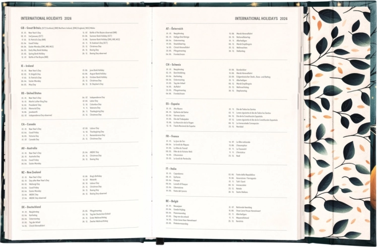 Týždenný diár v anglickom jazyku s medzinárodnými sviatkami a praktickým magnetickým uzatváraním je ideálny pre tých, ktorí chcú mať svoje plány prehľadne pod kontrolou.