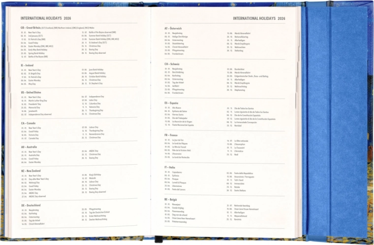 Týždenný diár s magnetickým uzáverom a medzinárodnými sviatkami, ideálny pre prehľadné plánovanie v anglickom jazyku. Zobraziť viac