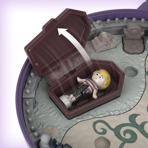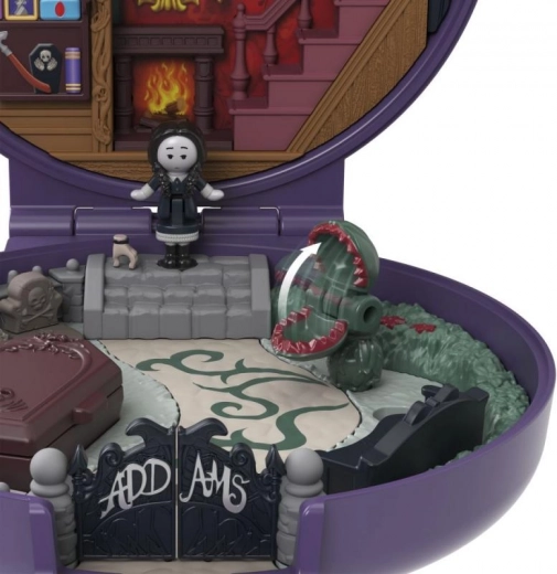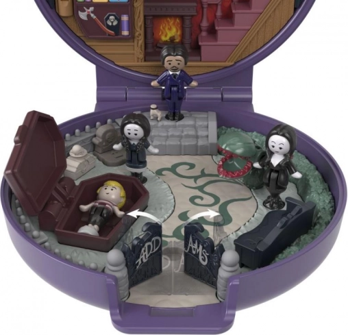 Pripravte sa na strašidelne zábavné dobrodružstvo s ikonickou Rodinou Addamsovcov v mini prevedení Polly Pocket! Tento kompaktný zberateľský set s 3D „strašidelným“ portrétom sa po otvorení premení na detailný strašidelný dom s dvorom, plný skrytých vychytávok a kultových scén. Nájdete v ňom 4 mikrobábiky, figúrku Veci, ktorú možno nasadiť na ramená postavičiek, trezor za knižnicou, truhlicu, brnenie aj mäsožravú rastlinu pre akčné príbehy fanúšikov.