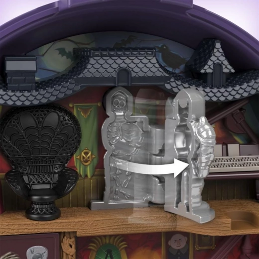 Užite si mágiu sveta Rodiny Addamsovcov vo vreckovom formáte. Kompakt v tmavofialovom dizajne ukrýva viacpodlažný interiér s krbom, schodiskom a bránou „ADDAMS“, ktorý láka na objavovanie. Set je ideálny pre zberateľov aj deti – ponúka interaktívne prvky, prekvapenia a nespočet možností pre imaginatívne hranie.
