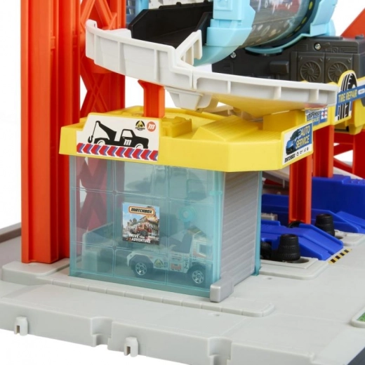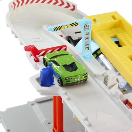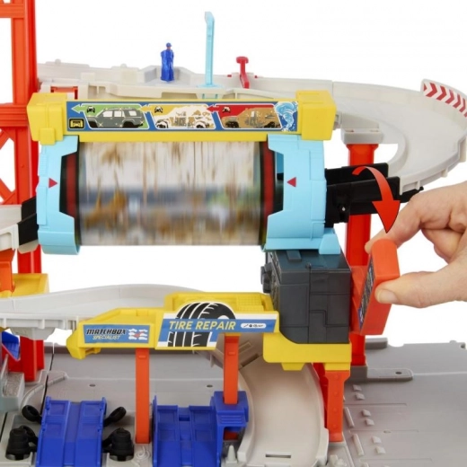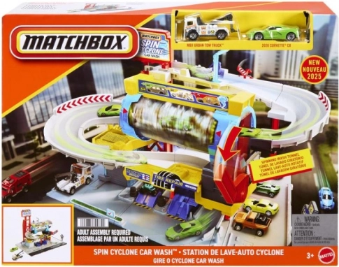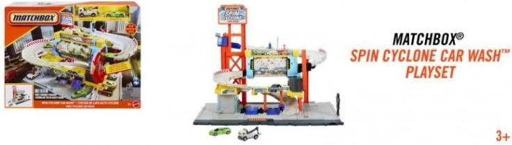Herný set Matchbox Turbo Cyklón premení detskú izbu na rušnú autoumývareň a servis. Autíčka vyjdú po špirálovej rampe do horného poschodia, kde ich „parkovač“ navedie do otáčavého umývacieho tunela. Potiahnite za páku a priehľadný bubon sa roztočí – náhodne zastaví v režime „špinavý“, „namydlený“ alebo „čistý“. Keď je vozidlo „čisté“, automaticky zíde po rampe dolu a uvoľní miesto ďalšiemu.