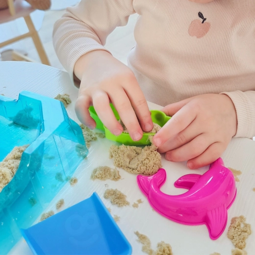 Kinetický piesok je mäkký, príjemný na dotyk, dobre drží tvar, nevysychá a nelepí sa na ruky – ideálny pre zmyslovú hru detí od 3 rokov.