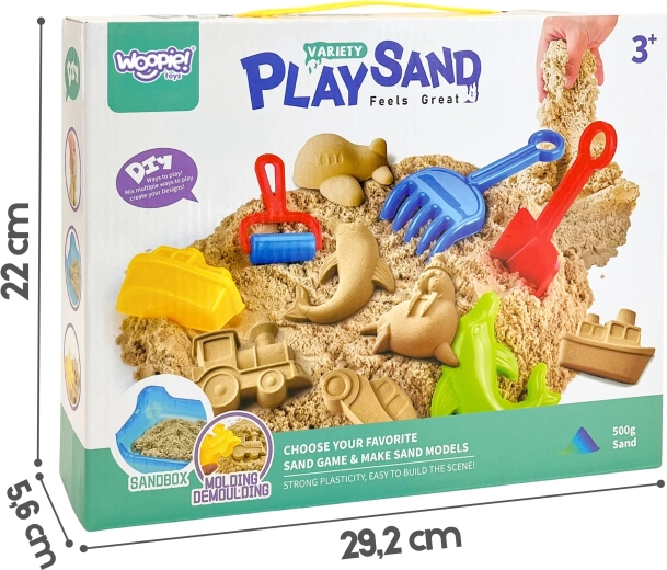 S touto sadou kinetického piesku WOOPIE môžu deti tvoriť zábavné tvary – od zvieratiek po dopravné prostriedky. Piesok je samodržiaci, drží tvar, nevysychá a je ideálny na zmyslovú hru doma na stole. Ľahké nástroje zvládnu aj malé detské ruky.