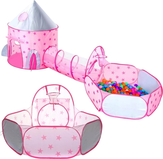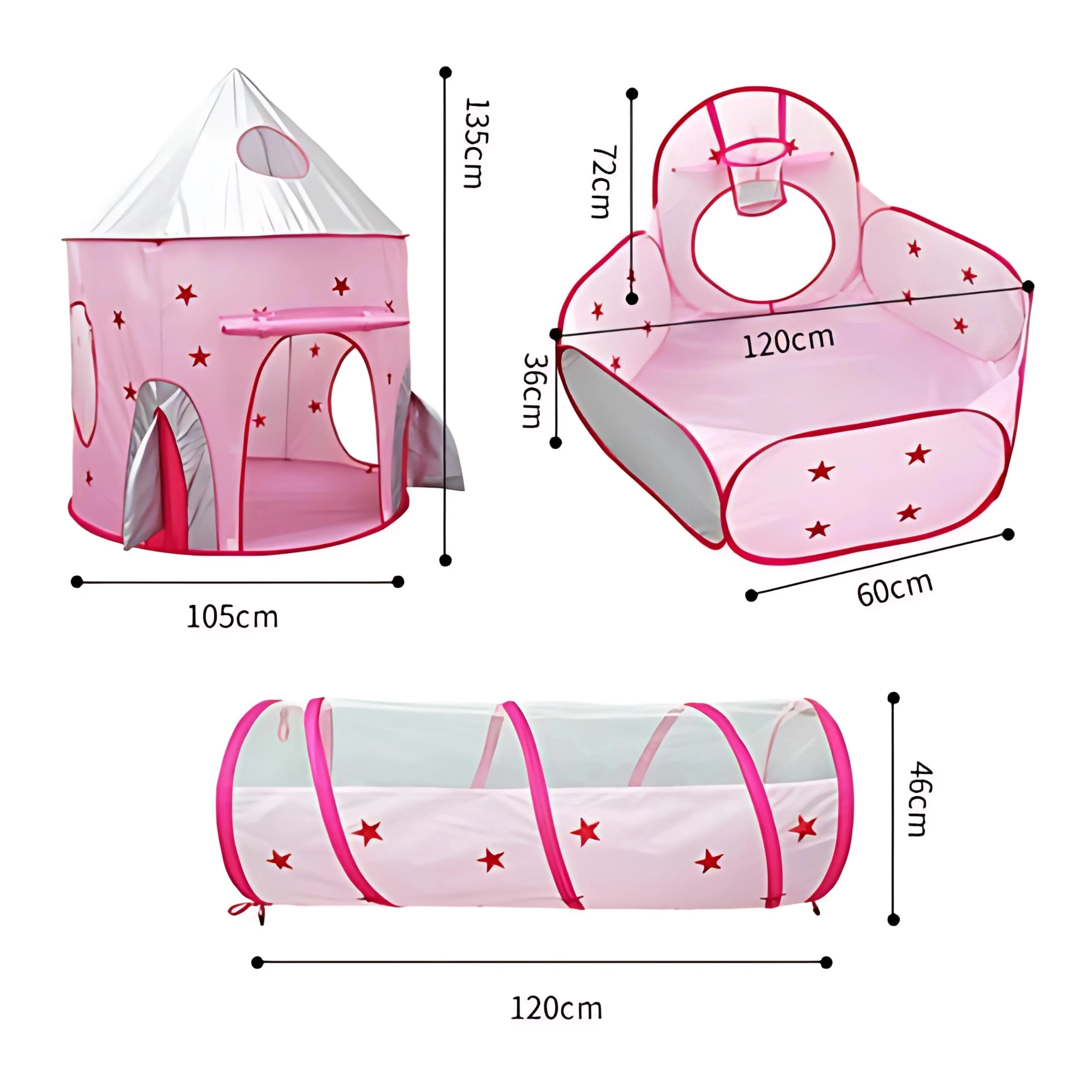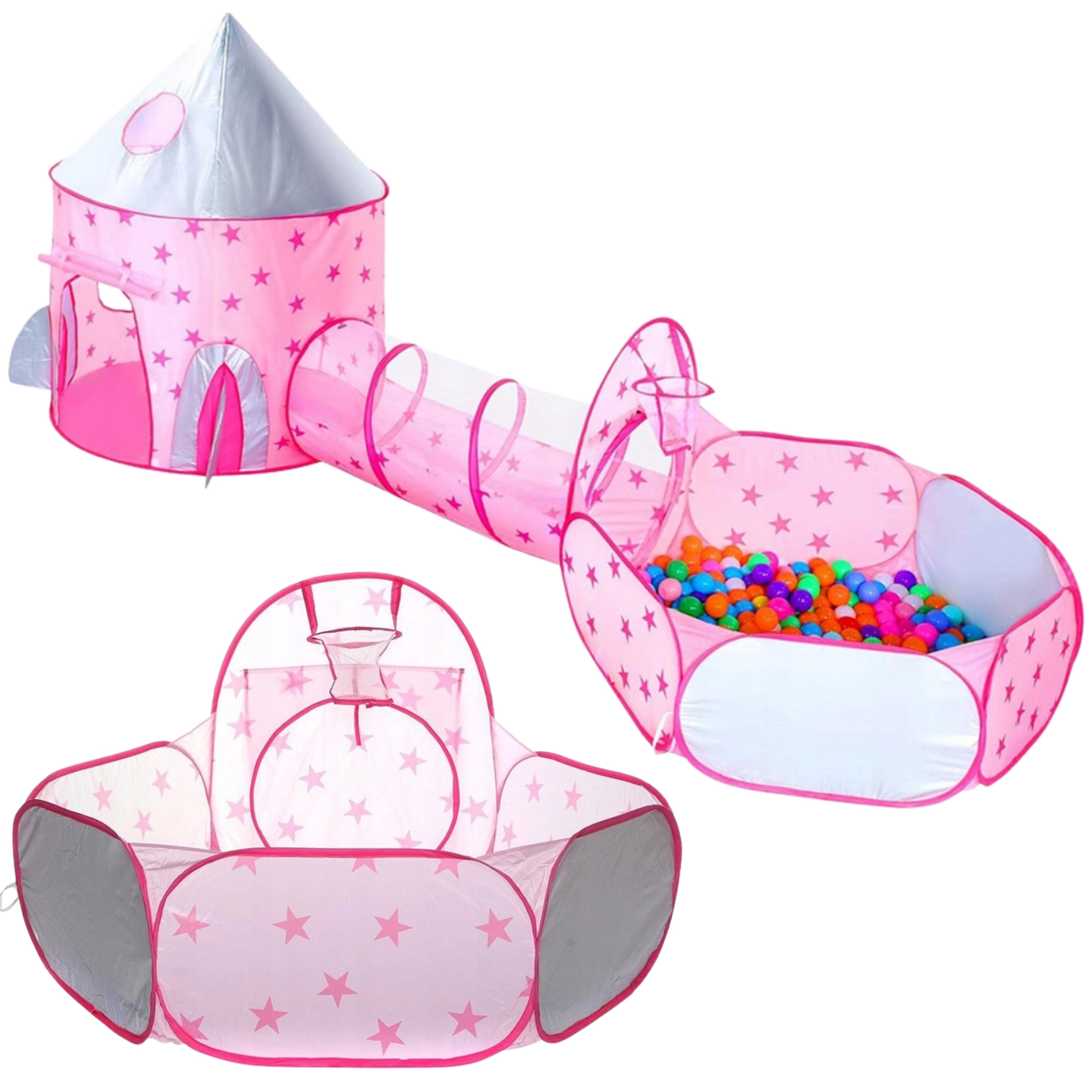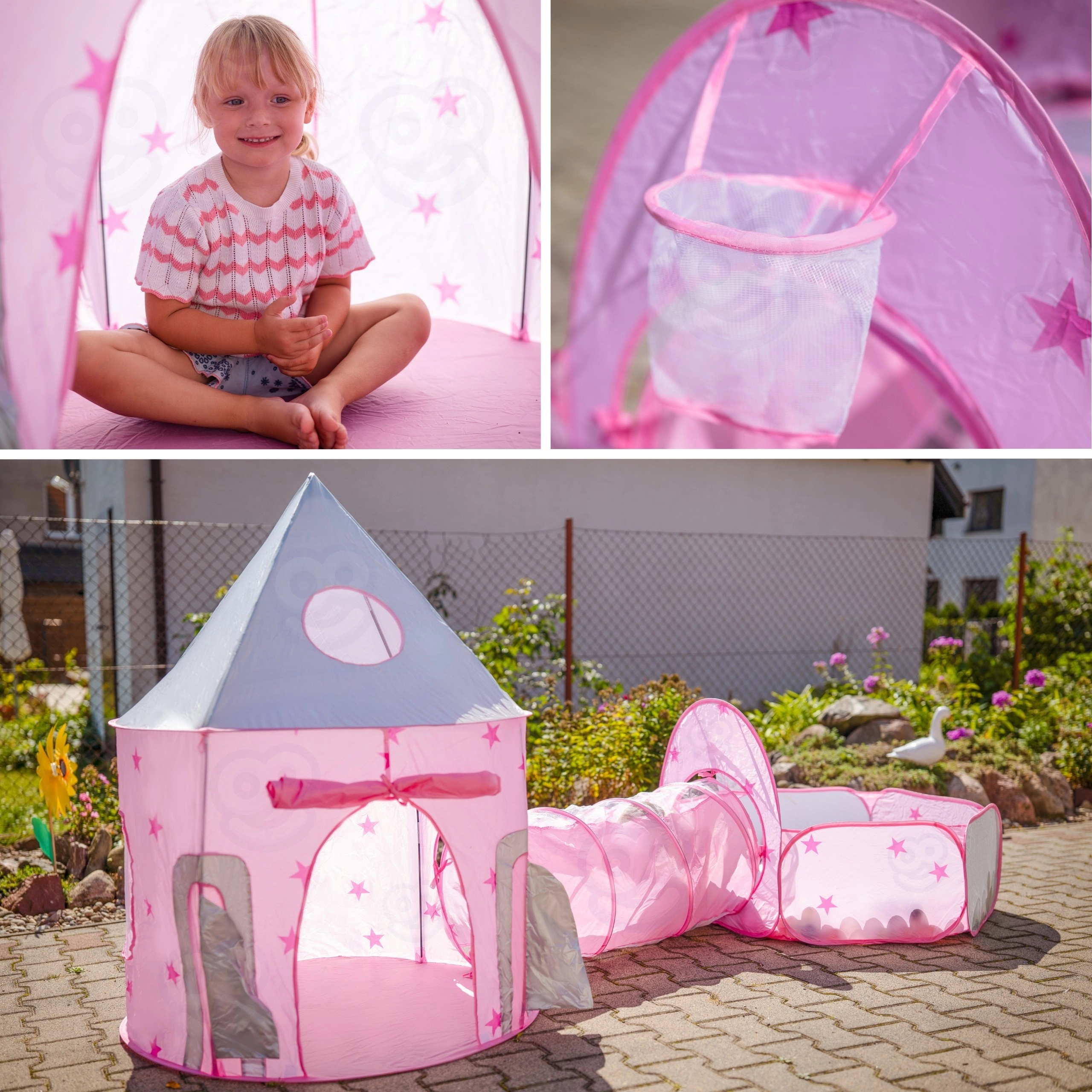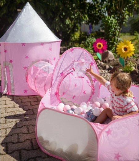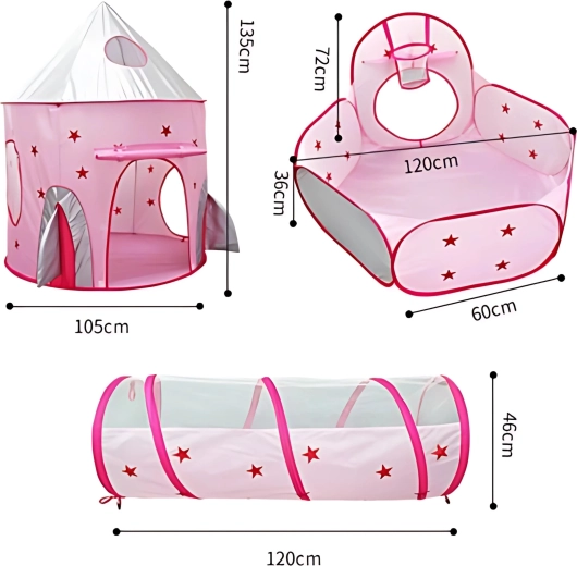 Ružový hrací set 3v1 od značky Woopie premení každú izbu aj záhradu na rozprávkové kráľovstvo. Obsahuje stan v tvare zámku, prepojovací tunel a priestranný suchý bazénik. Vďaka pop-up konštrukcii sa ľahko rozkladá aj skladá a je ideálny na aktívnu hru, rozvoj fantázie a spoločnú zábavu. Ľahký, skladací, vetraný sieťovinou a skvelý na vnútorné aj vonkajšie použitie.
