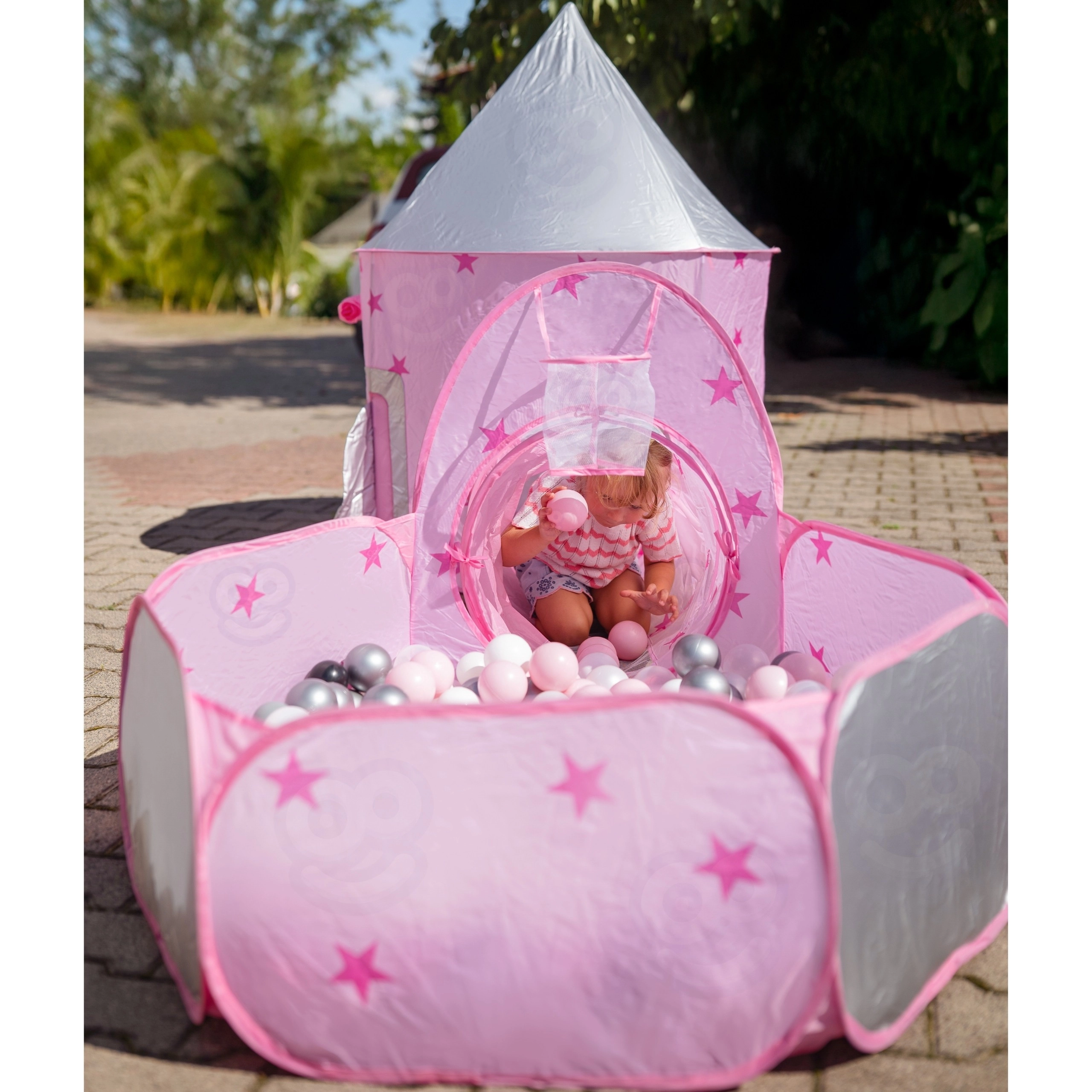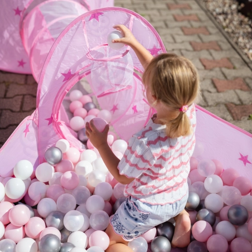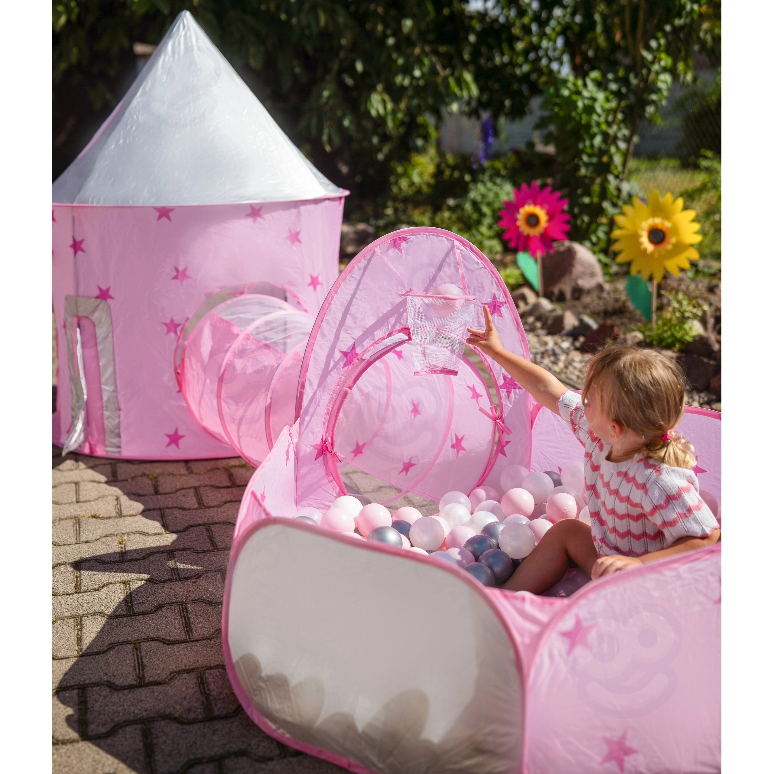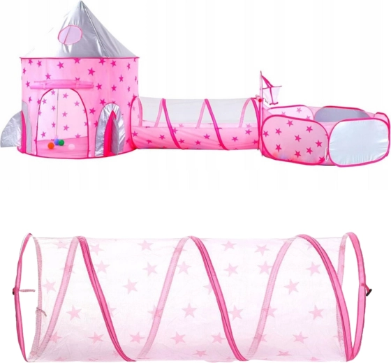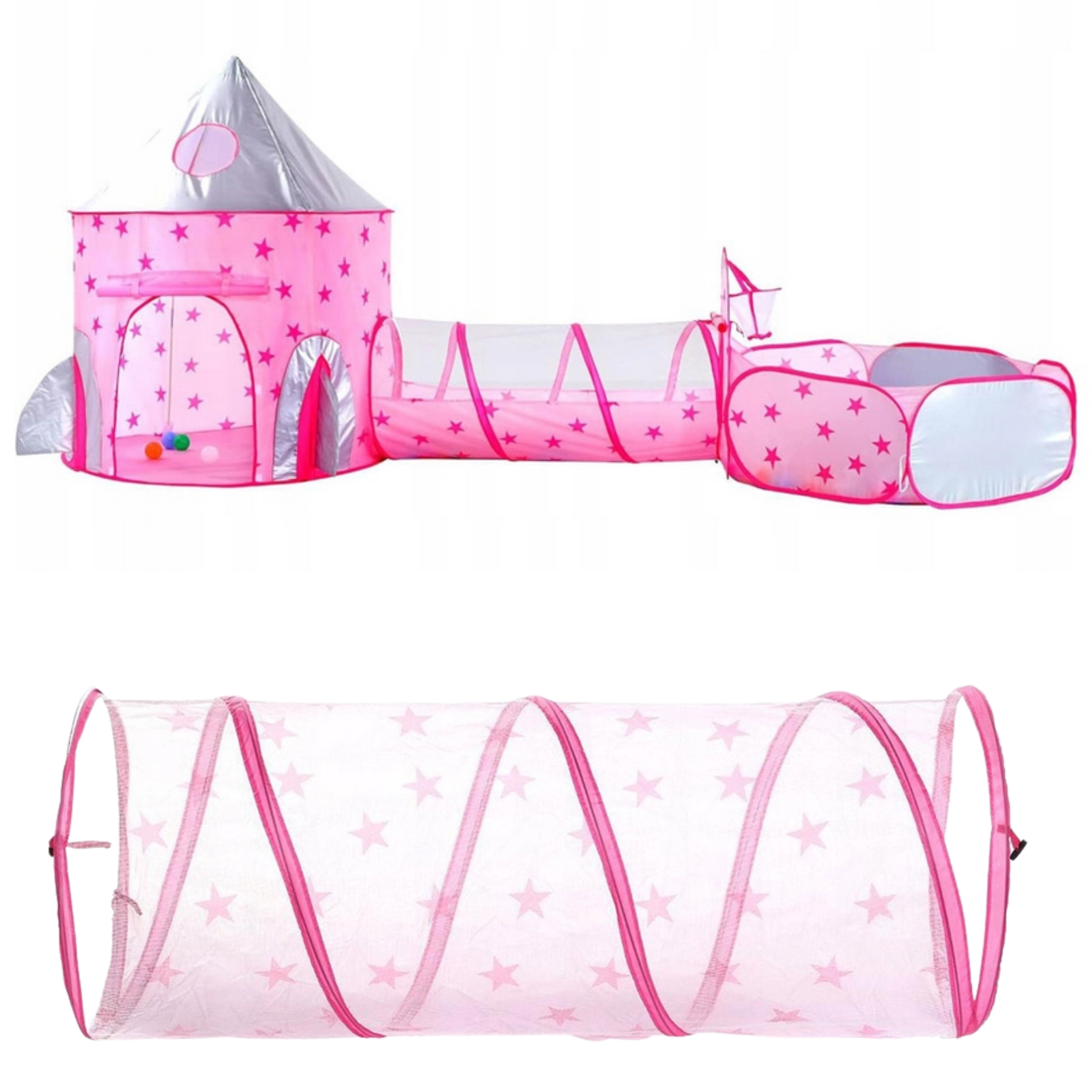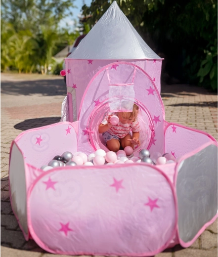 Ružový hrací set 3v1 od značky Woopie premení každú izbu aj záhradu na rozprávkové kráľovstvo. Obsahuje stan v tvare zámku, prepojovací tunel a priestranný suchý bazénik. Vďaka pop-up konštrukcii sa ľahko rozkladá aj skladá a je ideálny na aktívnu hru, rozvoj fantázie a spoločnú zábavu. Ľahký, skladací, vetraný sieťovinou a skvelý na vnútorné aj vonkajšie použitie.