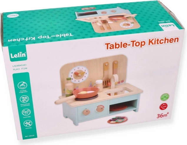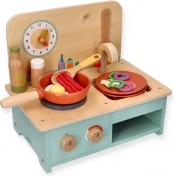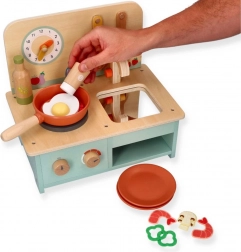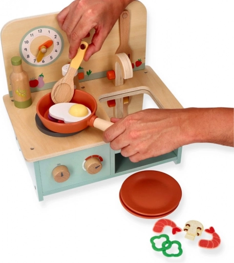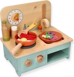 Táto kompaktná drevená kuchynka ponúka deťom príležitosť zapojiť sa do role-playing aktivít a rozvíjať svoje zručnosti. Je špeciálne navrhnutá pre deti od 3 rokov a staršie, čo ju robí ideálnou pre predškolské deti. Kuchynka je vybavená realitickými detailmi ako sú otočné gombíky a hodiny.
