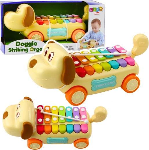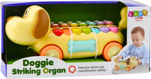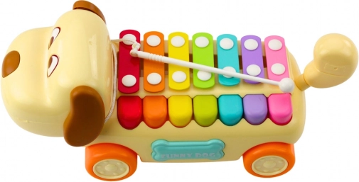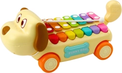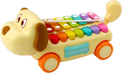 Jazdiaci psík je vybavený úplnou škálou farebných činiek, ktoré môžete rozohrať priloženou paličkou. Vďaka pripevneniu paličky k hračke na šnúrke je zabránené jej strate aj počas intenzívnej hry. Psík je vyrobený z odolných a bezpečných materiálov, jeho konštrukcia podporuje rozvoj koordinácie ruka-oko, jemnej motoriky a hudobnej citlivosti. Ideálny ako vzdelávacia hračka pre deti od 18 mesiacov.