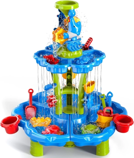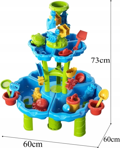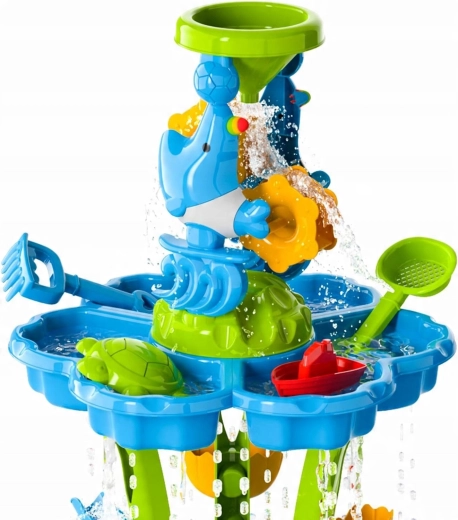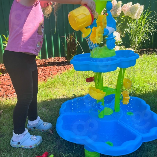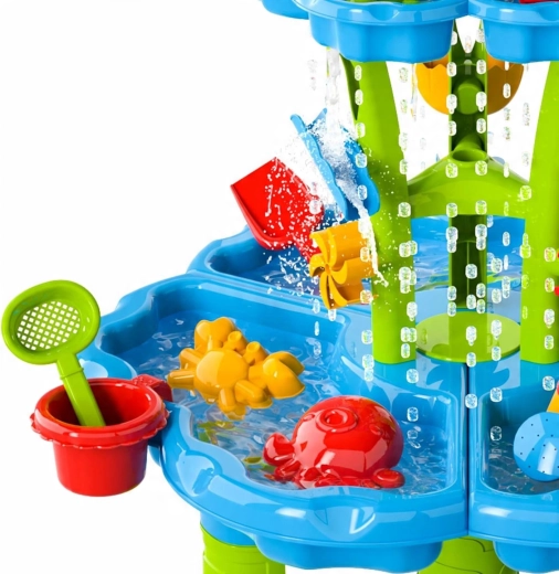 Vytvorte deťom ich vlastný mini aquapark. Stolík ponúka tri samostatné komory – jednu môžete naplniť vodou, druhú pieskom a tretiu nechať na miešanie a experimenty. Voda steká cez kaskádové žľaby, roztáča kolesá a prepadá cez bránky, takže deti vidia jasné príčinné súvislosti a rozvíjajú jemnú motoriku.