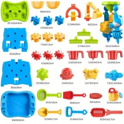 - 2× lopatka, hrable, 2× sitko, krhlička, vedierko, 4× formička, 5× pohárik na vodu, 10× vodné koleso, dvojité vodné koleso s lievikom, 3× žľabík