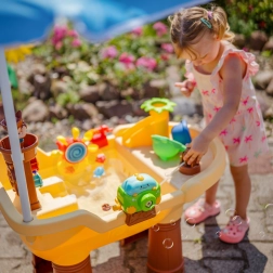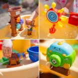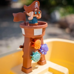 Veža s pirátom, kormidlo, kotva a vodný zjazd vytvárajú autentický pirátsky svet. Deti nalievajú vodu do lievikov, roztáčajú kolesá a spúšťajú vodné cesty.