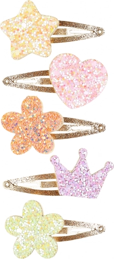 Táto nádherná sada sponiek do vlasov obsahuje päť kusov s trblietavými ozdobami v tvare hviezdy, srdca, kvetiny a koruny. Sponky sú ľahko použiteľné vďaka zacvakávaciemu mechanizmu, ktorý zabezpečí, že zostanú na svojom mieste celý deň. Sú ideálnym doplnkom do vlasov pre každé dievčatko.
