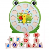 Drevené hodiny skladačka žabka je zábavná a edukačná hračka, ktorá pomáha deťom učiť sa čítať hodiny a rozvíjať kreativitu pomocou skladania.