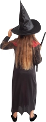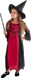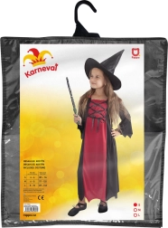 Kostým zahŕňa čierne a červené šaty s dlhým strihom a detailným šnurovaním, ktoré vytvárajú autentický čarodejnícky štýl. Perfektný pre Halloween či karnevalové oslavy.