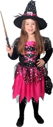 Magický kostým pre malé čarodejnice! Tento čierno-ružový kostým je ideálny pre dievčatá od 4 do 6 rokov, zdobený ružovými stuhami a striebornými hviezdičkami.