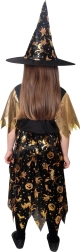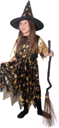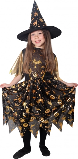 Halloweensky kostým pre malé čarodejnice! Kostým v čierno-zlatej farbe je ideálny pre dievčatká vo veku 6-8 rokov. Zlaté halloweenske motívy robia tieto šaty neodolateľnými. Súčasťou je perfektne zladený čarodejnícky klobúk.