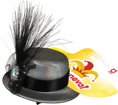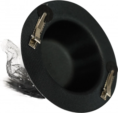 Elegantný strieborný mini klobúk s čiernou stuhou, perím a tylom ozdobený šperkom dodá vášmu účesu šmrnc. Ľahko sa pripevní vďaka dvom sponkám pre bezpečné nosenie.