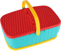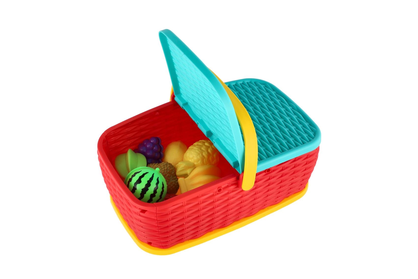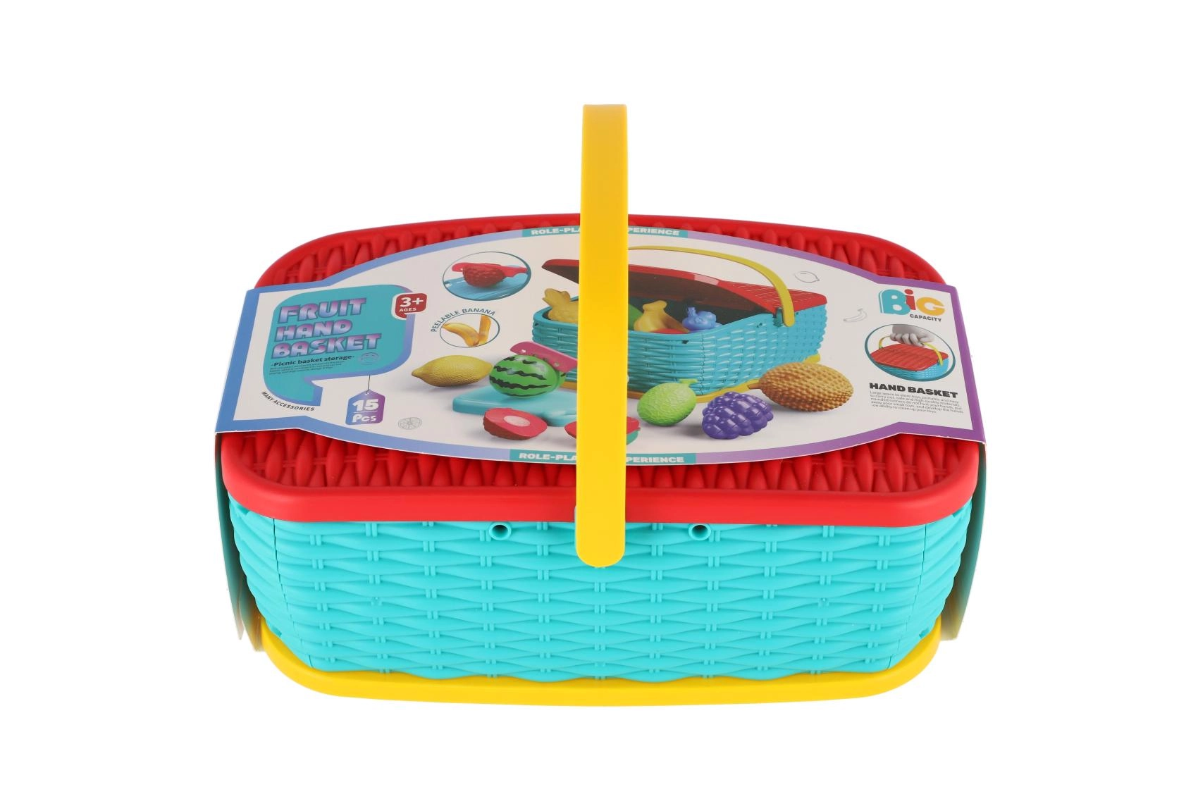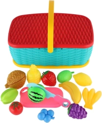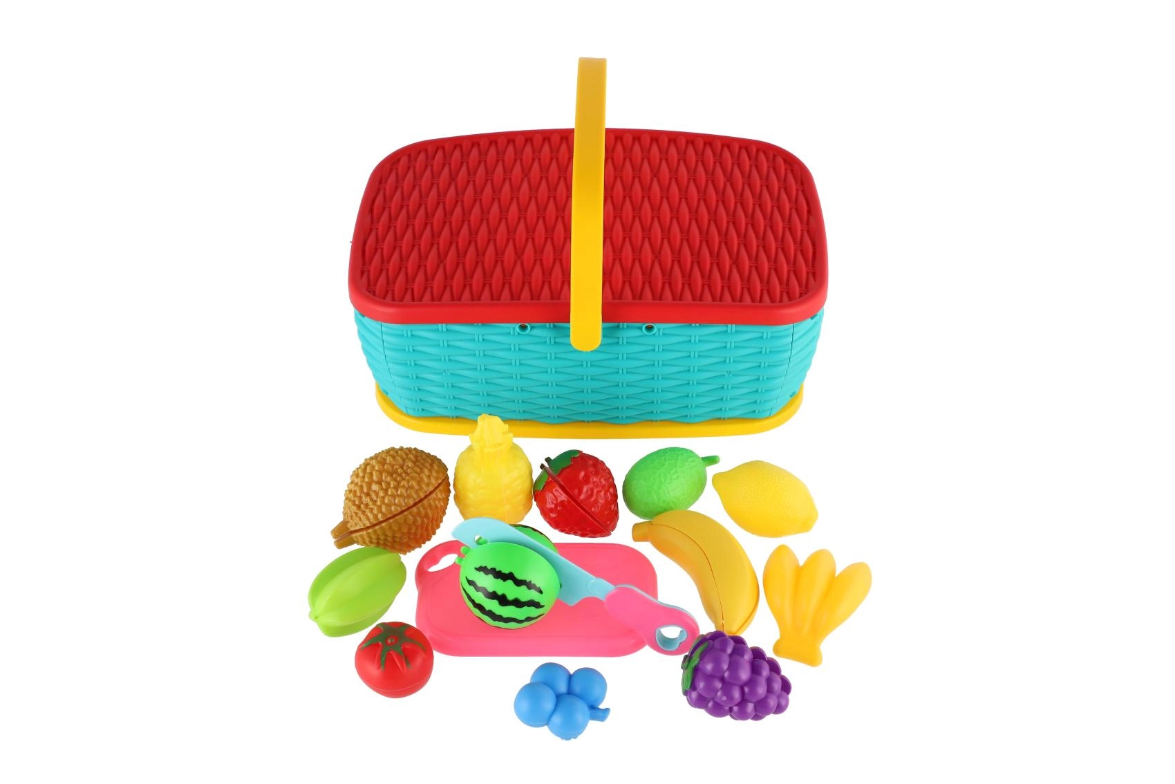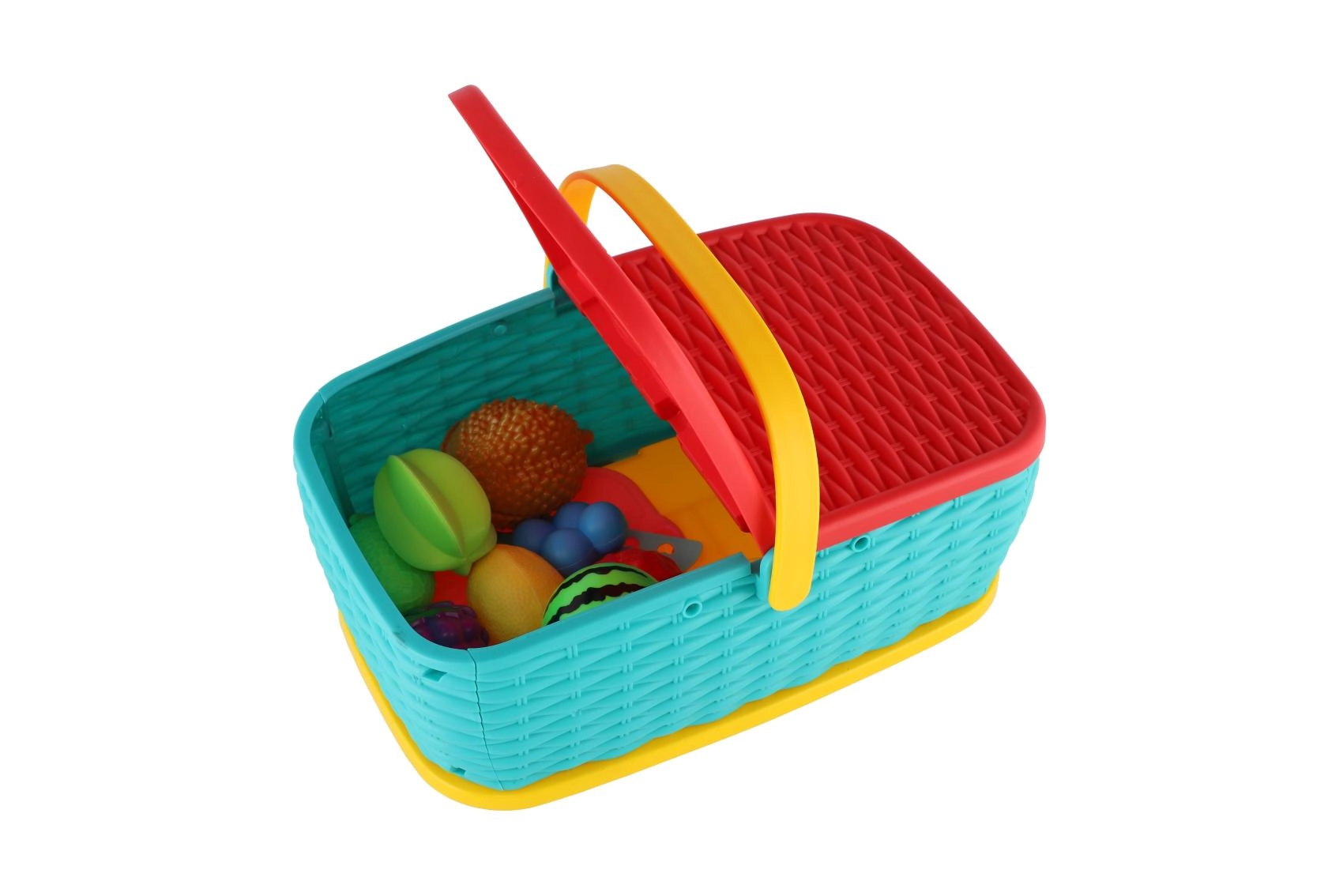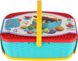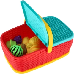 Hurá na piknik! Tento farebný plastový košík ukrýva sadu 15 dielov s ovocím a zeleninou, ktoré si deti môžu „krájať“ bezpečným plastovým nožom. Diely sú spojené suchým zipsom, takže ich možno opakovane rozpojovať a spájať. Skvelá hračka na rozvoj jemnej motoriky, fantázie a hier na kuchára.
