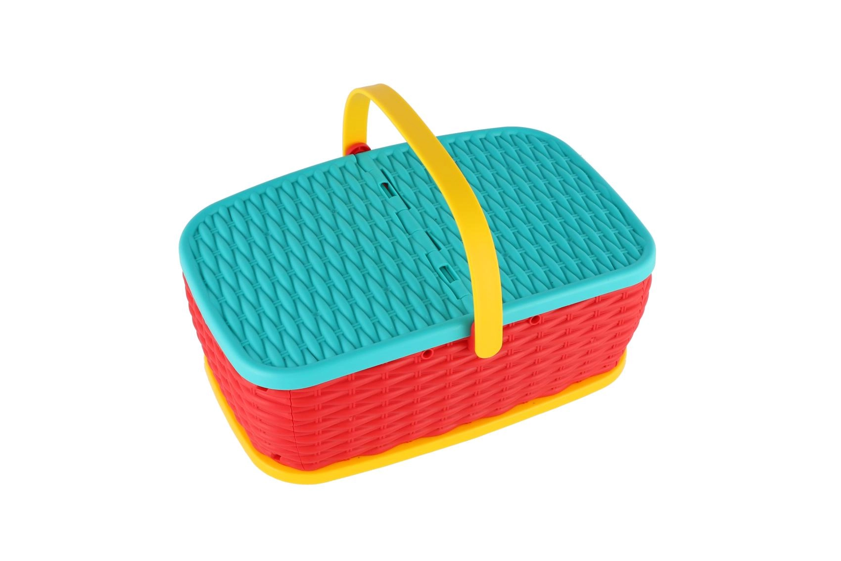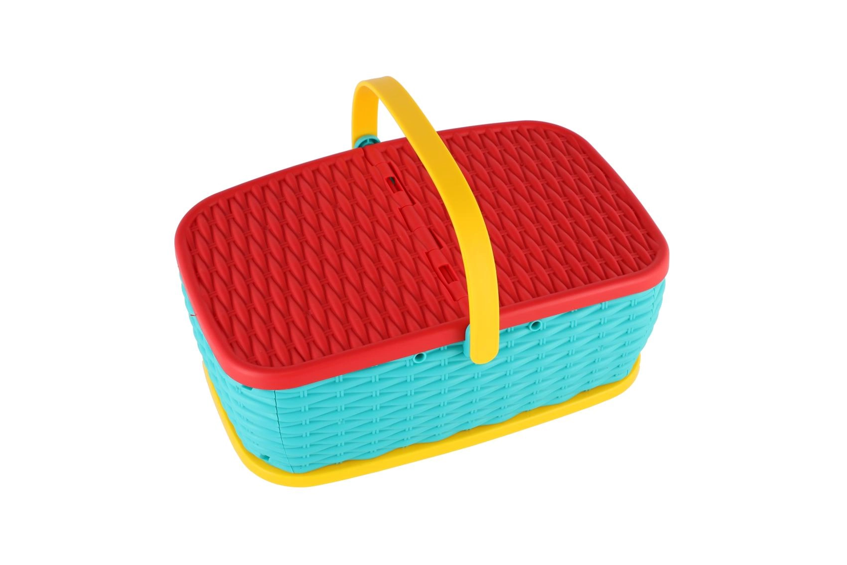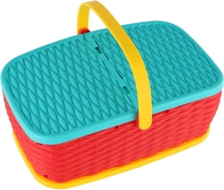 Ľahký košík s vekom a sklopným držadlom udrží všetky diely pokope. Ľahko sa prenáša na piknik, k babičke aj do detskej izbičky.