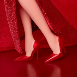 - Rubínovo červené topánky na podpätku dopĺňajú jej úchvatný vzhľad a zlaté náušnice s motívom „M“ odkazujú na tradičné logo Mattel.