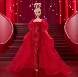 - Táto nádherná bábika je oblečená ako hviezda na červenom koberci s trblietavými šatami s tylovými rukávmi a vlečkou.