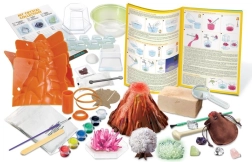 - model sopky, vykopávací blok s minerálmi, nástroje (dlátko, štetček, lupa), formy a misky, farby, kryštálové materiály, ilustrovaný návod