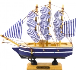 Štýlový model plachetnice s klasickou konštrukciou je ideálny pre všetkých obdivovateľov námornej estetiky. Tradičné trojsťažňové plachtoví v bielomodrých pruhoch a granátový trup s bielym pruhom vytvárajú efektný vzhľad. Vďaka estetickým proporciám a ručnému dokončeniu vyniká model jemnými detailmi a elegantným vzhľadom.