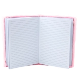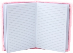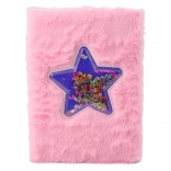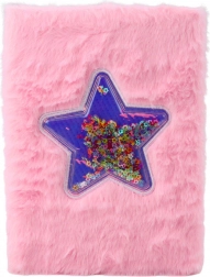 Obal je vyrobený z mäkkého, príjemného materiálu v intenzívnej ružovej farbe. V strede sa nachádza priehľadná aplikácia v tvare hviezdy, vo vnútri ktorej sú farebné konfety, ktoré sa voľne pohybujú pri každom pohybe zápisníkom. Tento detail odlišuje produkt od klasických zápisníkov.