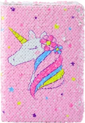 Obal zápisníka je pokrytý pohyblivými, trblietavými flitrami, ktoré menia farbu z ružovej na bielu len prešuchnutím ruky. Pod touto fascinujúcou vrstvou nájdete magický motív jednorožca s kvetinovou ozdobou, ktorý uchváti každého milovníka magických bytostí.