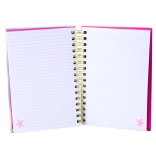 Vnútorné strany majú 90 listov s ružovými linajkami, čo je ideálne pre školské poznámky, kreatívne písanie alebo vedenie denníka. Pevná špirálová väzba uľahčuje otváranie a prekladanie listov. Formát A5 je praktický na každodenné používanie – v škole, doma alebo v práci.