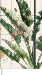Vychutnajte si eleganciu zápisníka s tvrdým matným obalom, zdobeným realistickým motívom veľkých zelených listov na svetlom pozadí. Centrálne umiestnený nápis „Let life grow“ dodáva pozitívny náboj a jemnú energiu.