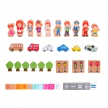 • 10 drevených figúriek postáv, 6 stromov a 6 vozidiel.
