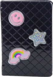 Zošit vo formáte B6 s čiernym obalom pokrytým ochrannou fóliou zabezpečuje dlhodobú odolnosť a štýl. Brokátová povrchová úprava spolu s nášivkami v podobe hviezdy, úsmevu a dúhy dodávajú moderný vzhľad.