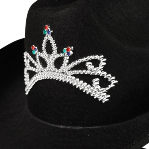 Čierny kovbojský klobúk je zdobený striebornou korunou, ideálny pre každú vekovú skupinu. Štýlový doplnok, ktorý vás urobí neprehliadnuteľnou.