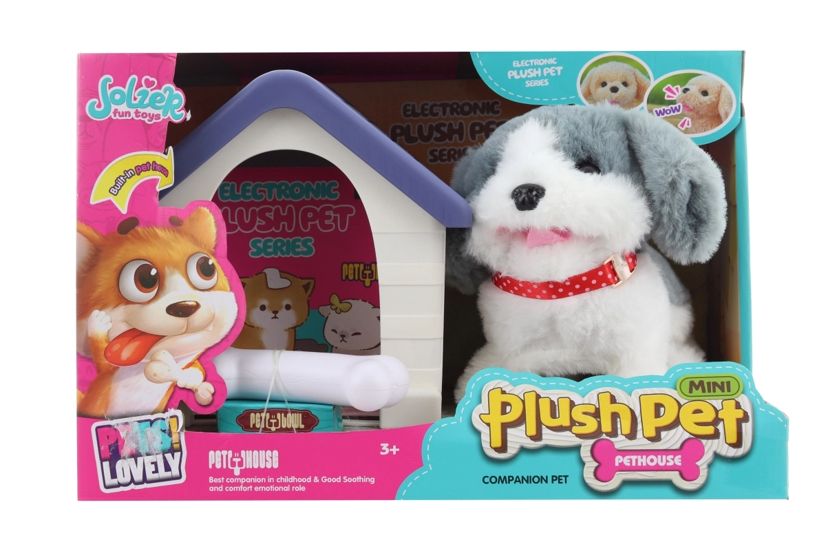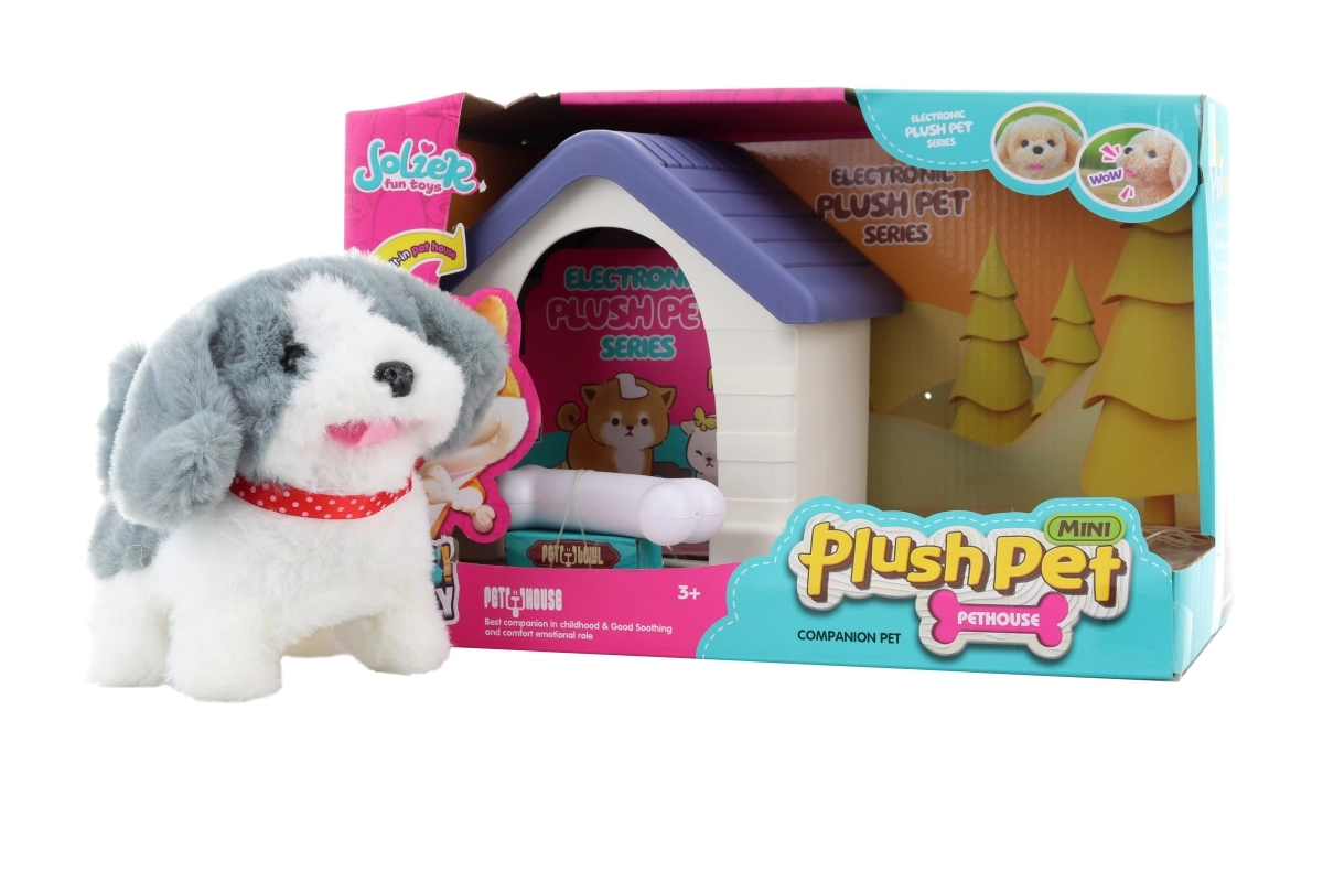 Balenie obsahuje nielen psíka, ale aj jeho búdu a hračku - kostičku. Vyrobené z plastu a plyšu, čo zaisťuje príjemný dotyk a vysokú odolnosť. Skvelý darček pre každú príležitosť!