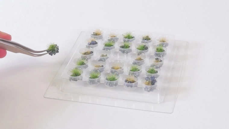 Ľahko sa lepia na akýkoľvek povrch bežným lepidlom na tvorbu krajiny. Pre zakomponovanie do väčších trávnatých plôch je možné ich usadiť priamo do podkladu potretého lepidlom na trávu. Následným zasypaním získate zelenú plochu, ktorá pôsobí veľmi prirodzene.