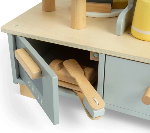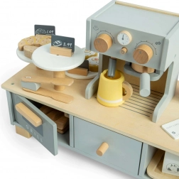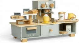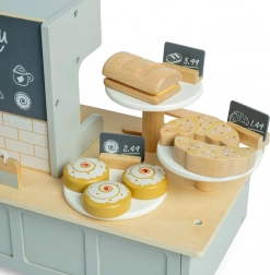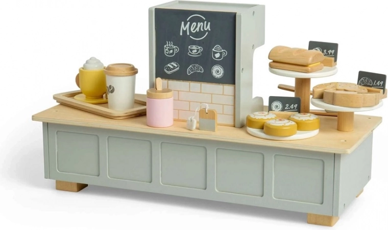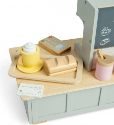 Deti môžu použiť drevenú bankovú kartu a terminál na platby ako v pravej kaviarni. Táto sada poskytuje hodiny zábavy a umožňuje rozvoj jazykových a sociálnych zručností.