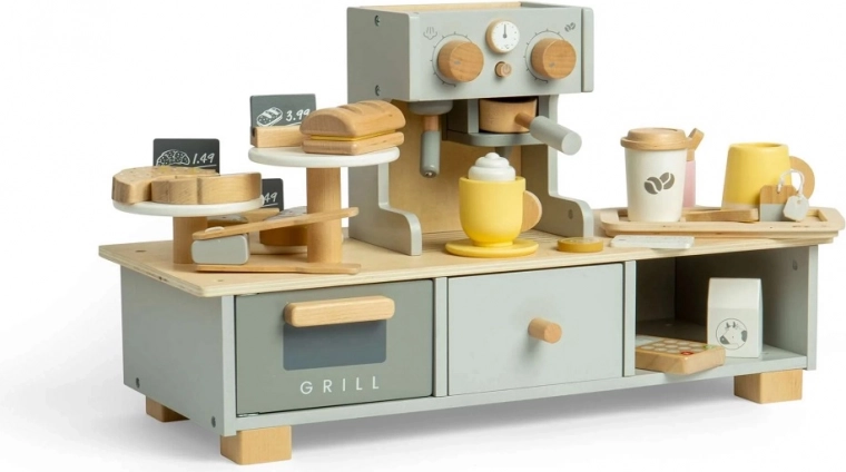S detskou kaviarenskou sadou Bigjigs Toys sa Vaše dieťa stane kreatívnym baristom. Sada ponúka širokú škálu príslušenstva ako je kávovar, servírovací pult s grilom, úložná zásuvka, a mnoho chutne vyzerajúcich doplnkov ako sú zákusky, šálky, podšálky, a kelímok na kávu so sebou.