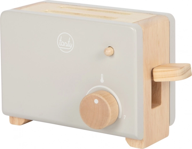 Tento malý drevený toustovač je ideálnym doplnkom do každej detskej kuchynky. Poskytne vašim deťom hodiny zábavy pri hrách na kuchára. Stačí vložiť plátky toustového chleba, otočiť kľukou a tousty sú pripravené na servírovanie.