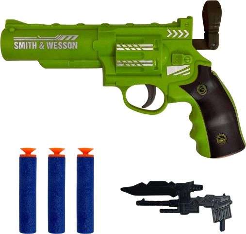 Súčasťou je štýlový revolver s 3 mäkkými šípkami. Skvelé na tréning presnosti a dynamickú hru bez rizika.