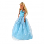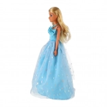 Dlhá svetlomodrá róba s jemným trblietaním a kvetinovým zdobením premení bábiku na kráľovnú každej imaginárnej slávnosti.