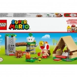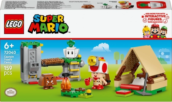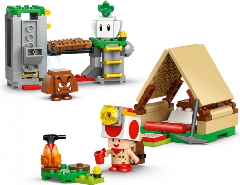 Vytvorte si dobrodružnú scénu s táborom kapitána Toada: postavte stan s truhlicou na poklady, rozďaľte ohník, preskúmajte skalnú plošinu a aktivujte padací most, ktorý pošle protivníka do „lávy“. Hľadajte a schovajte diamanty, porazte Goombu a oddychujte pri ohni – skrátka dokonalá porcia kreatívneho hrania.
